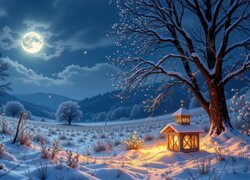 Tapeta dnia wybrana !! Wygrała tapeta Zima, Las, Drzewa, Krzewy, Noc, Dom, Światła, Latarnie, Śnieg, AI [LINK], dodana przez Ewa15 Gratulujemy!!