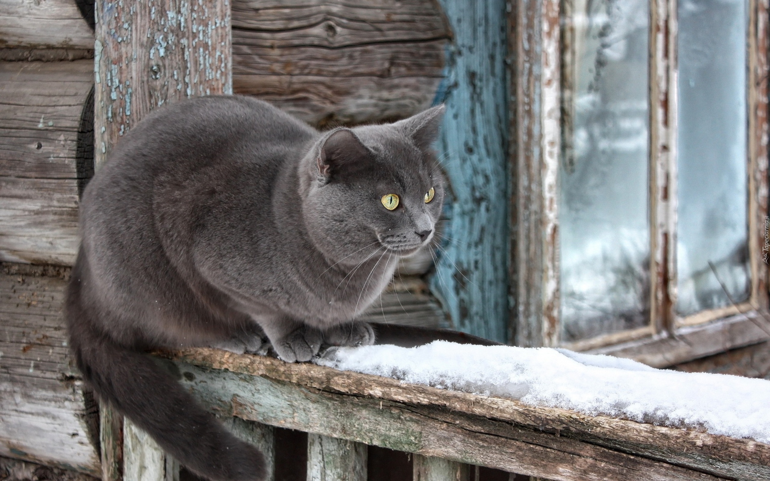 Kot brytyjski, Zima, Drewniana, Poręcz, Okno