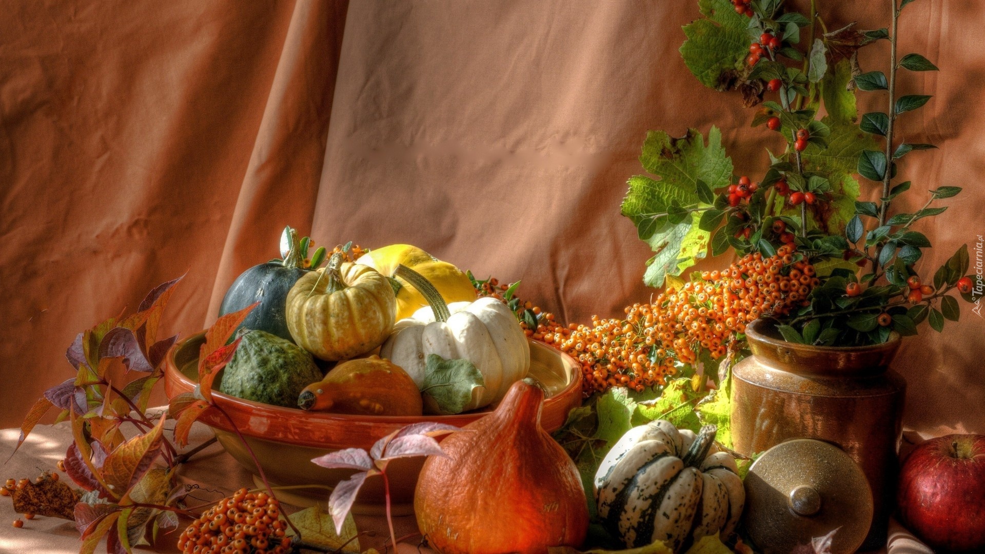 Barwna kompozycja z jesiennych płodów ziemi.