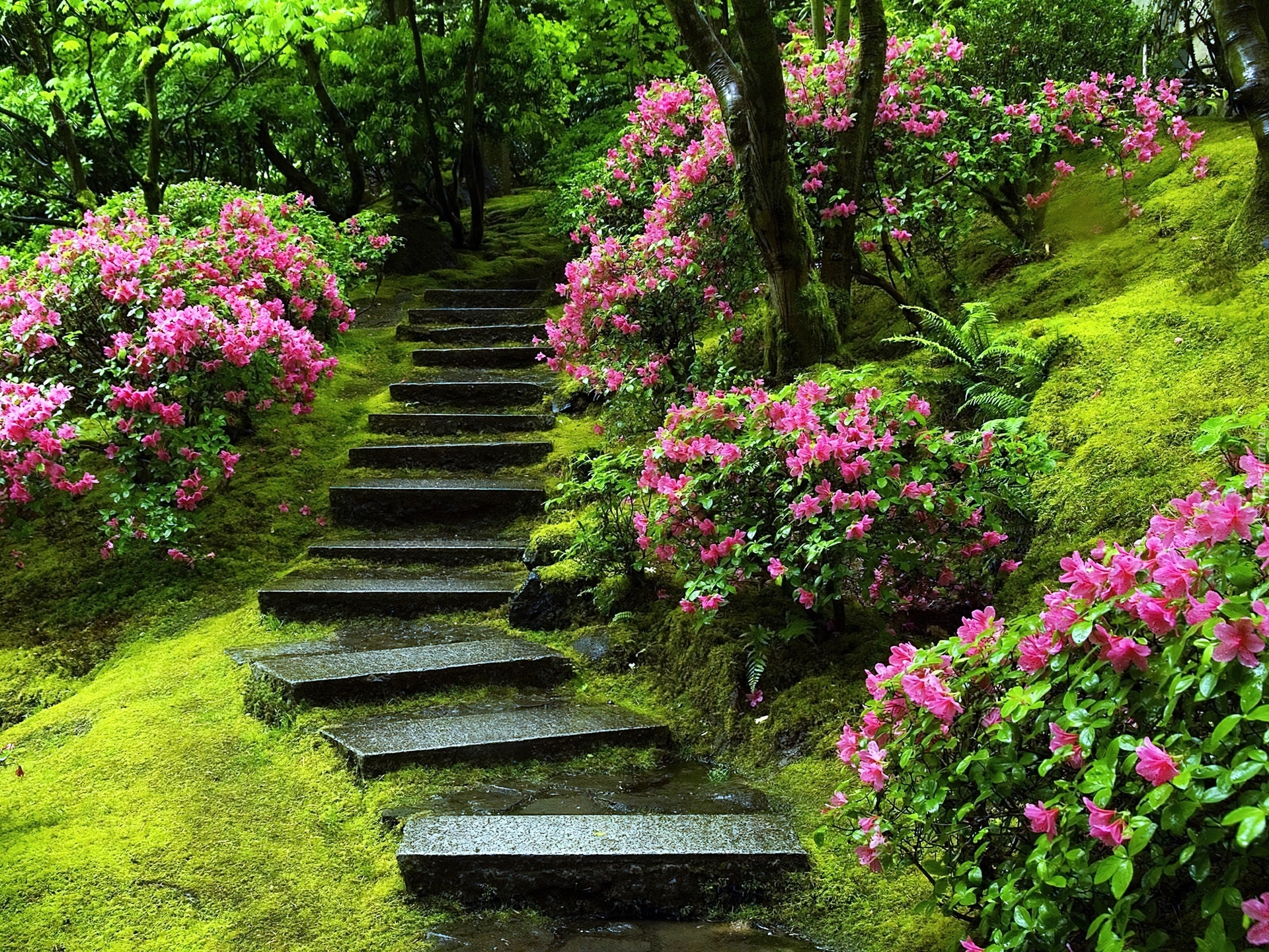 Park, Kwitnące, Rododendrony, Kamienne, Schodki