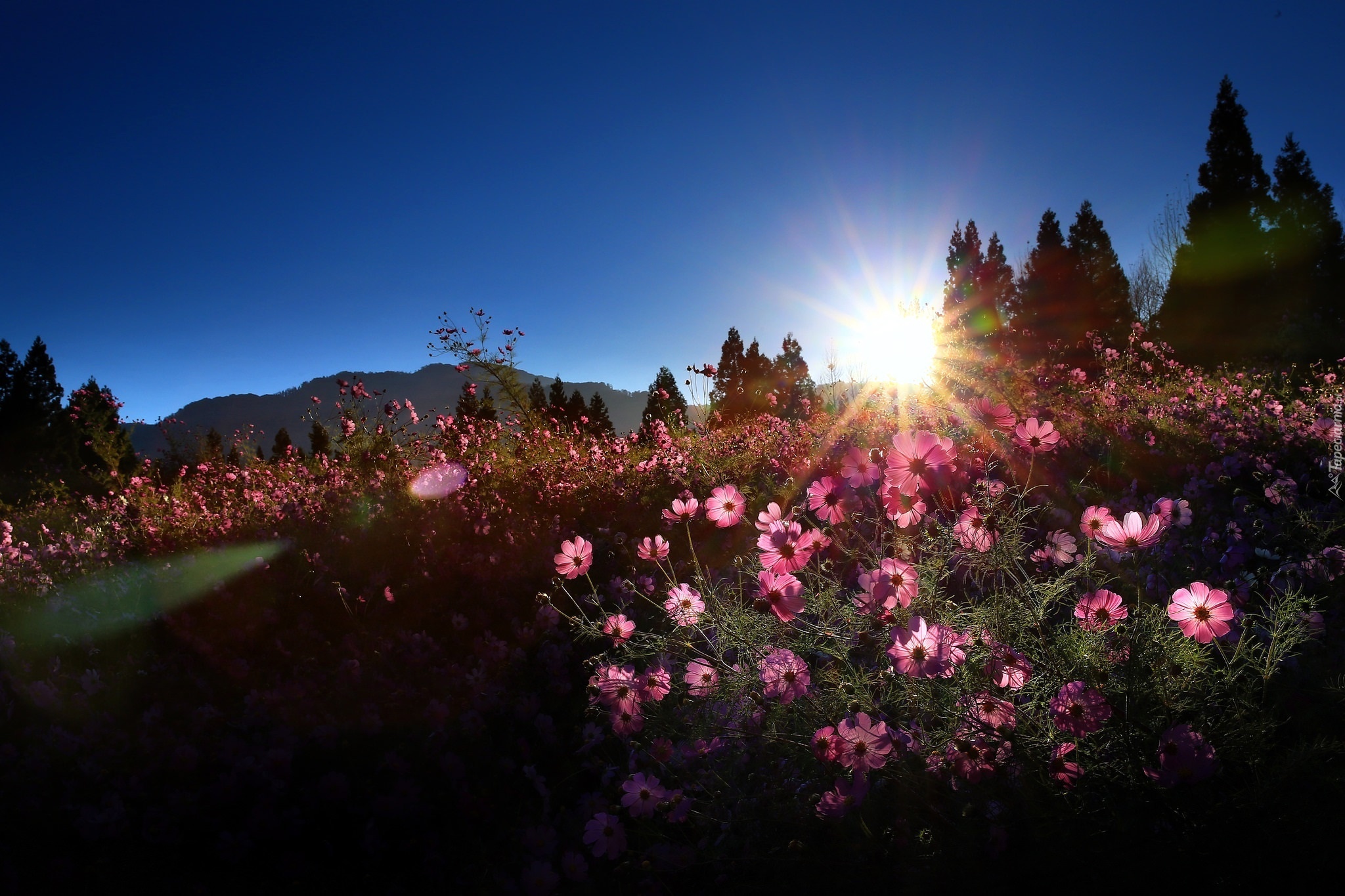 Kwiaty, Kosmea, Łąka, Wschód Słońca