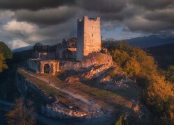 Zamek Radboud, Miasto Medemblik, Holandia, Jezioro IJsselmeer, Zachód słońca