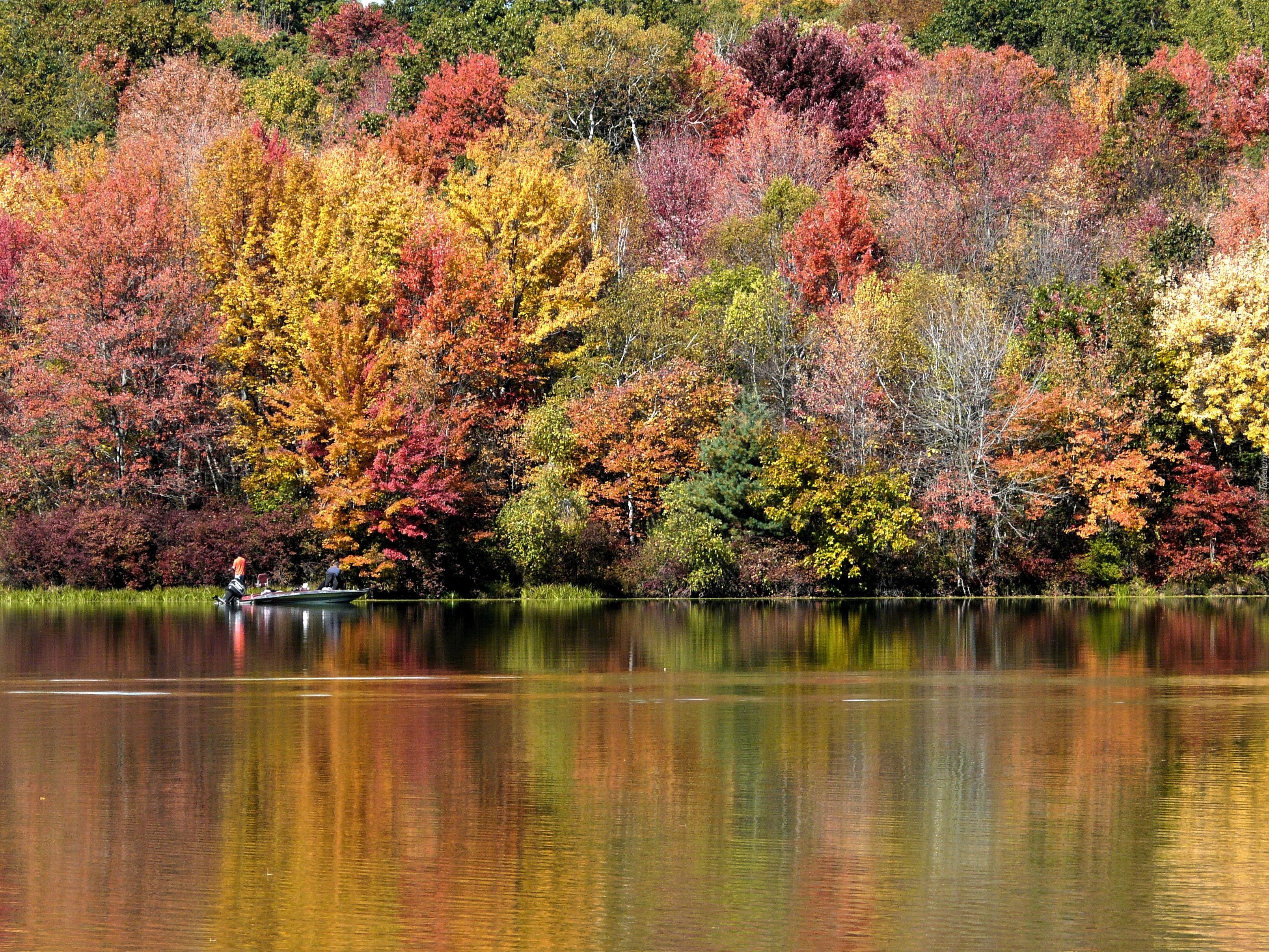 Jezioro, Las, Jesień, Łódź, Człowiek