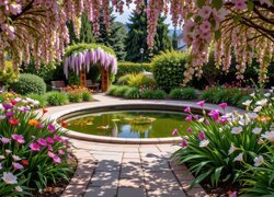 • Kwiaty oraz drzewa i latarnie przy ścieżce w ogrodzie
