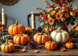 • Zapalone świece wśród dyń i szyszek oraz dwóch bukietów kwiatów w wazonach na stole