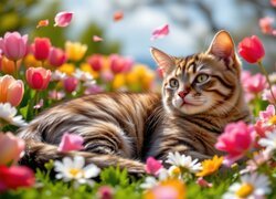 • Leżący rudo-biały kot obok lilii i tulipanów