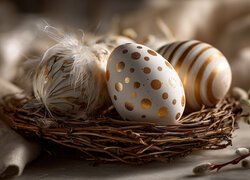 • Trzy pisanki w stylu rustykalnym zawieszone na ukwieconej gałązce