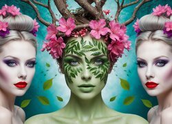 • Twarze trzech kobiet z różowymi kwiatami we włosach