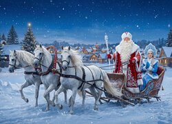 • Udekorowana choinka na placu i oświetlone nocą domy