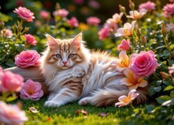• Leżący bury kot wśród kwiatów
