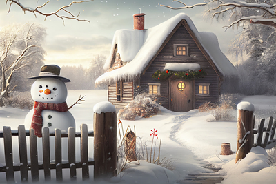 Tytuł: Jak każdej zimy, bałwan w kapeluszu i z różgą.