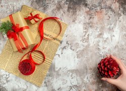 Opis: Trzy, Skrzaty, Czapki, Prezenty, Grafika AI