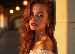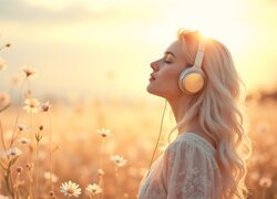 Opis: Kobieta, Blondynka, Słuchawki, Kwiaty
