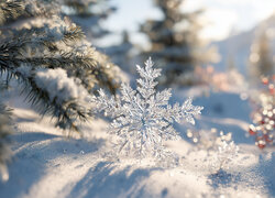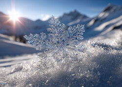 Opis: Śnieżynka, Śnieg, Słońce, Góry, Grafika AI