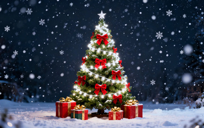 Opis: Boże Narodzenie, Choinka, Zima, Zorza polarna