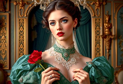 Opis: Kobieta, Szatynka, Długie, Włosy, Biżuteria, Naszyjnik, Motyle, Kwiaty, AI