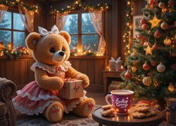 Opis: Świąteczne, Kanapa, Miś pluszowy, Prezent, Okno, Zima, Bałwanek