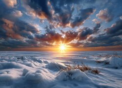Opis: Zima, Ośnieżone, Pole, Chmury, Zachód słońca, Grafika AI