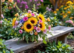 Opis: Kwiaty, Słoneczniki, Róże, Stokrotki, Bukiet, Wazon, Stół