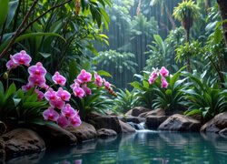 Opis: Kamienie, Oczko wodne, Kwiaty, Kolorowe, Storczyki, Rośliny, Grafika AI
