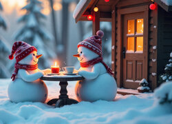 Małe kotki zimową porą mają zabawę z bałwanem.