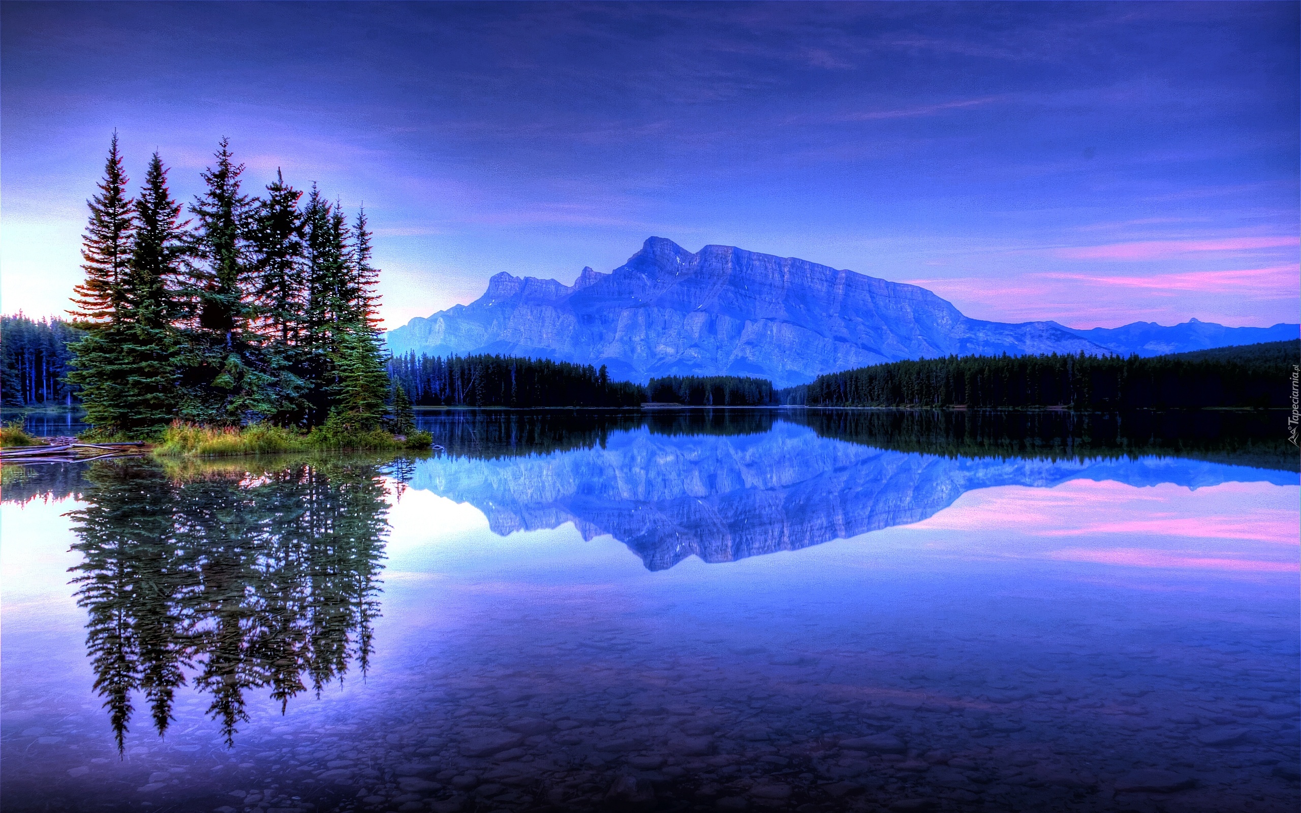 Edytor tapety: Góry, Drzewa, Jezioro, Odbicie