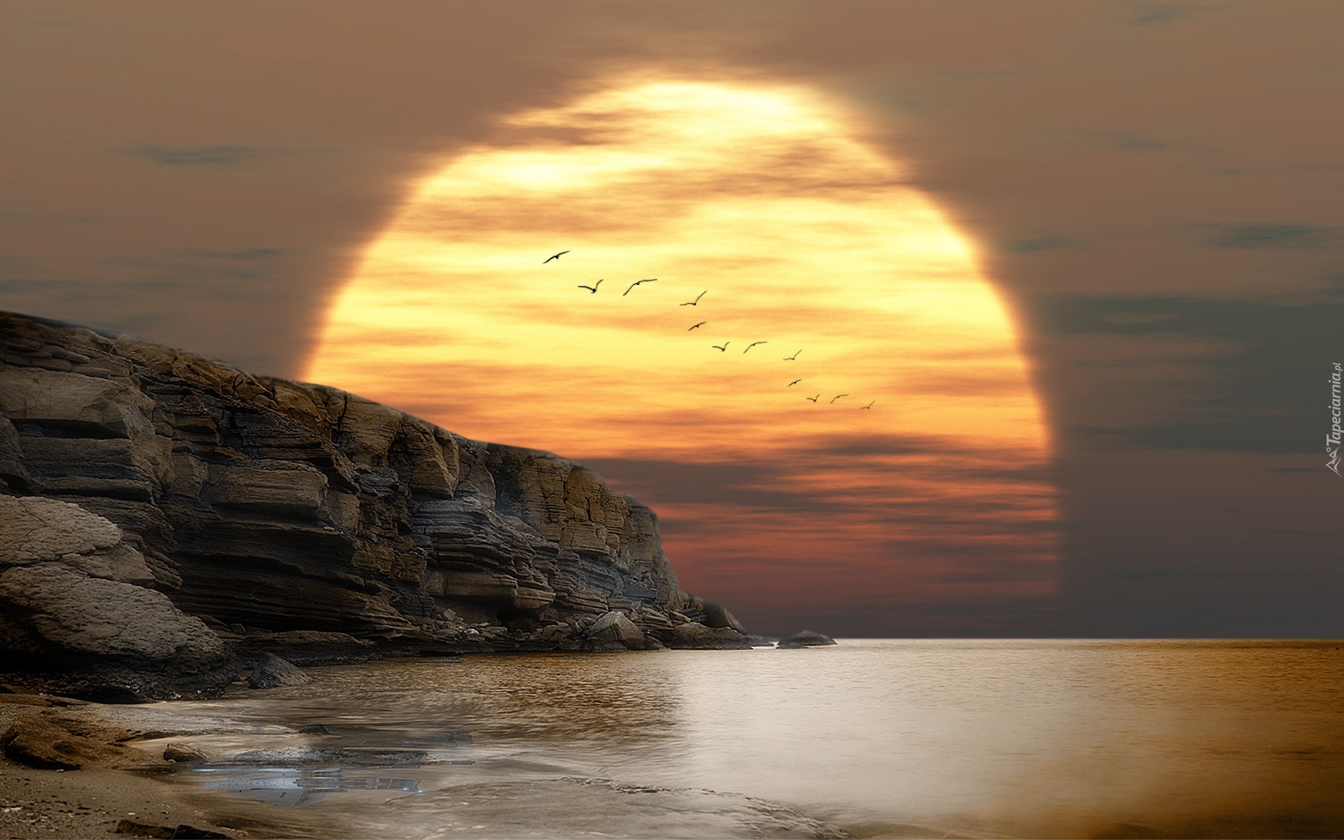 Edytor tapety: Zachod, Słońca, Ptaki, Klif