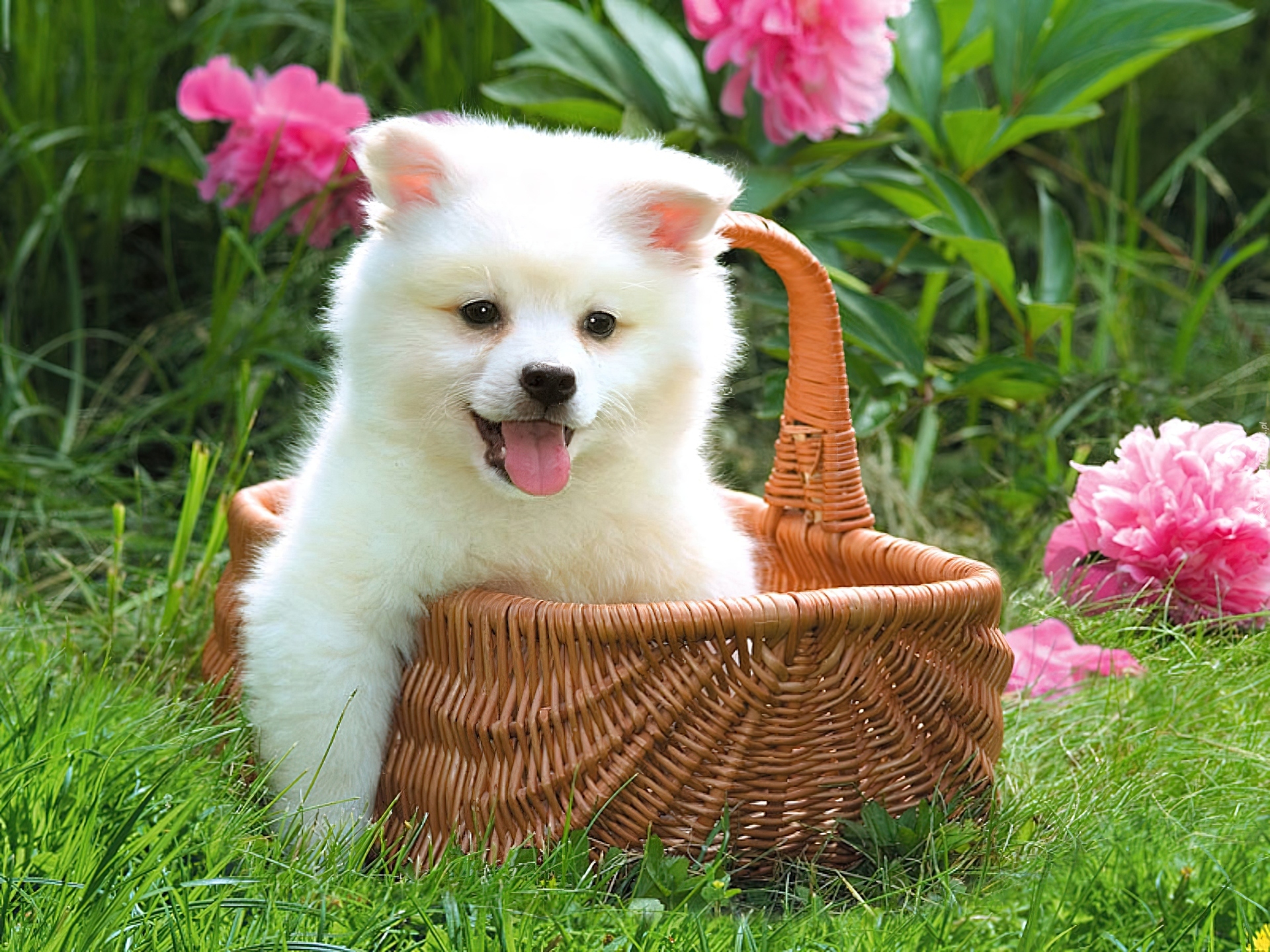Edytor tapety: Trawa, Kwiaty, Koszyk, Piesek