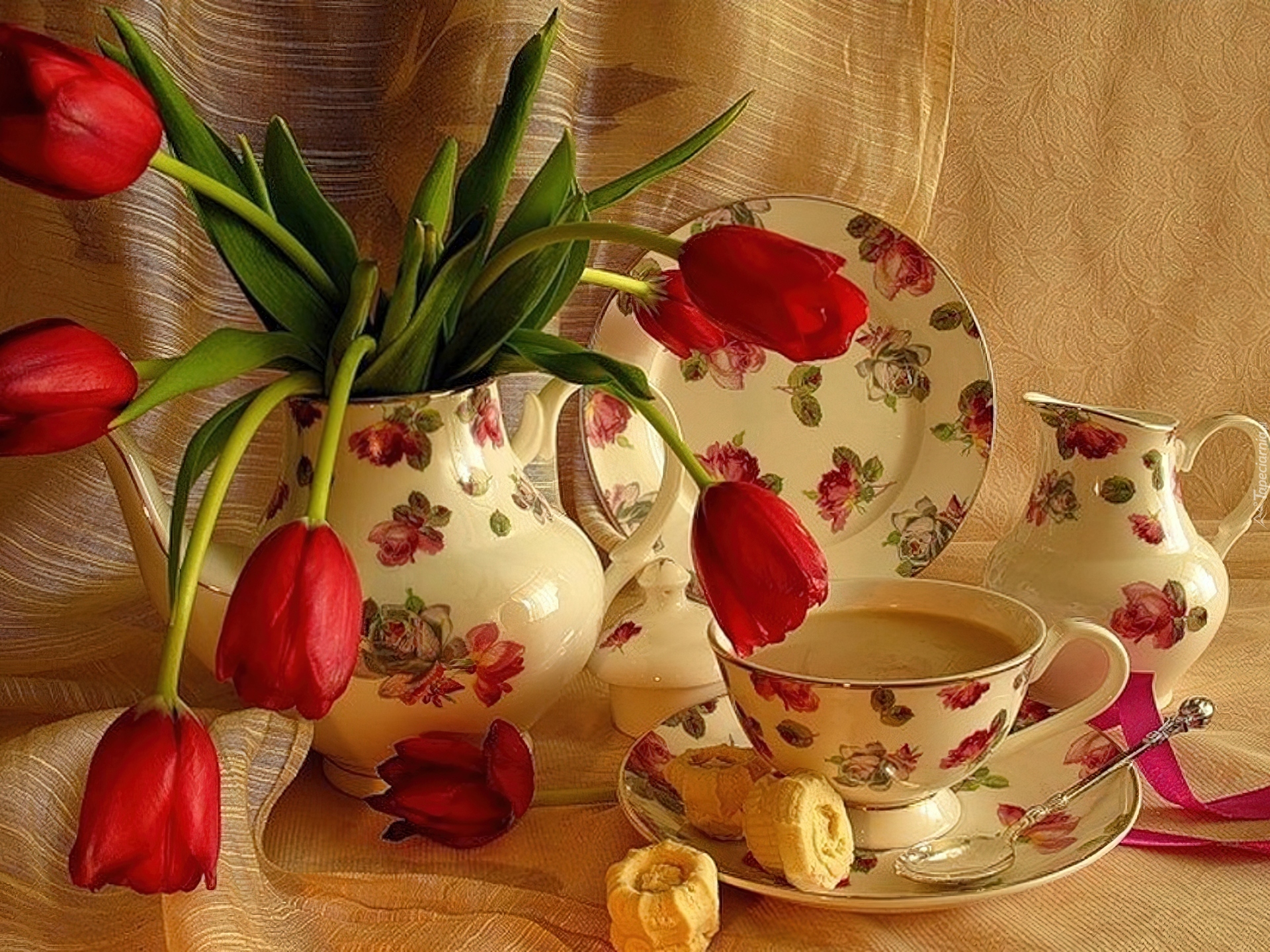 Edytor tapety: Porcelana, Kawa, Tulipany