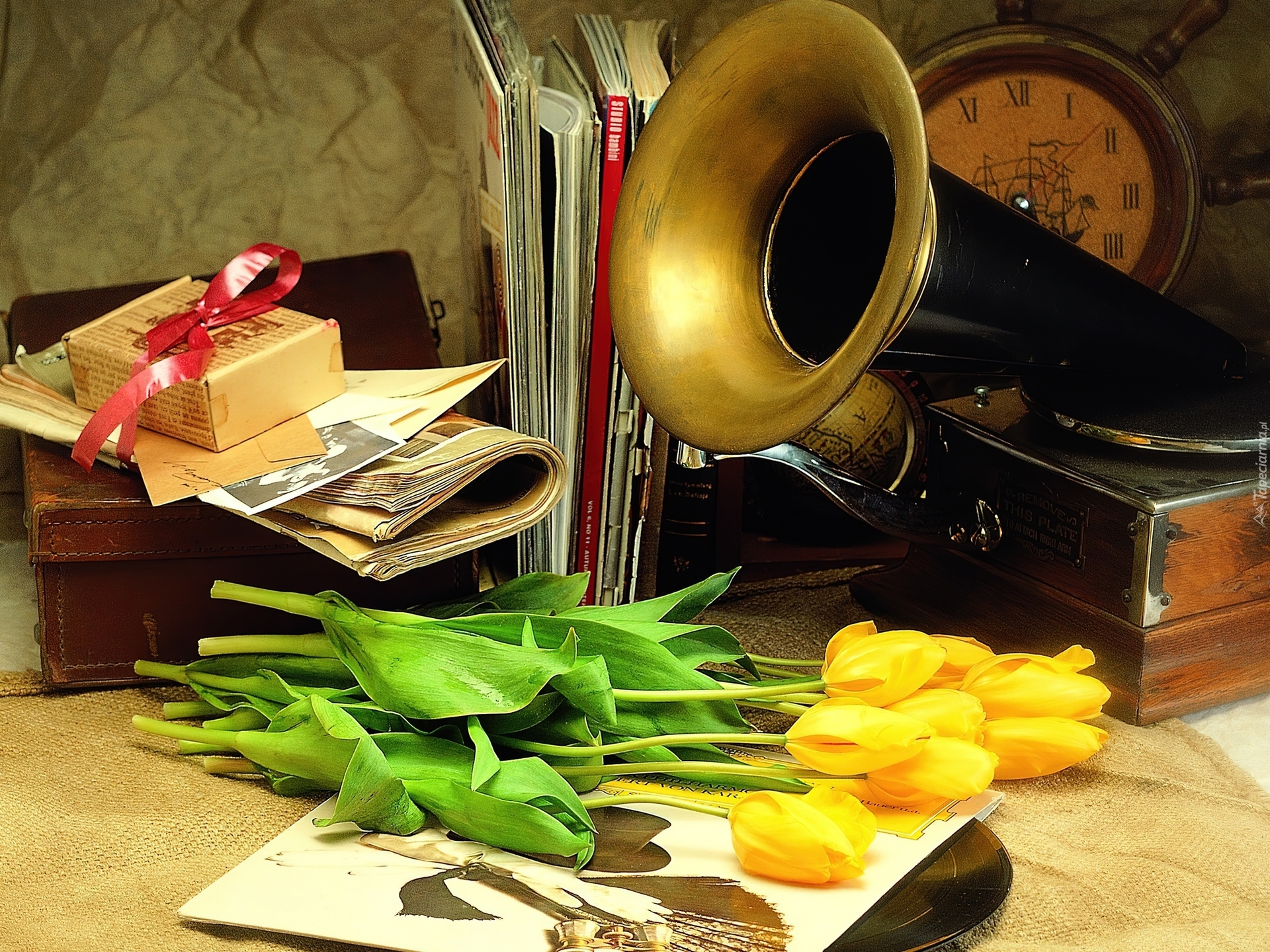 Edytor tapety: Gramofon, Tulipany