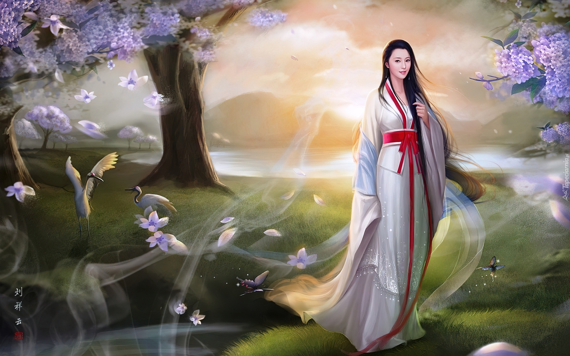 Edytor tapety: Dziewczyna, Ptaki, Woda, Kwiaty