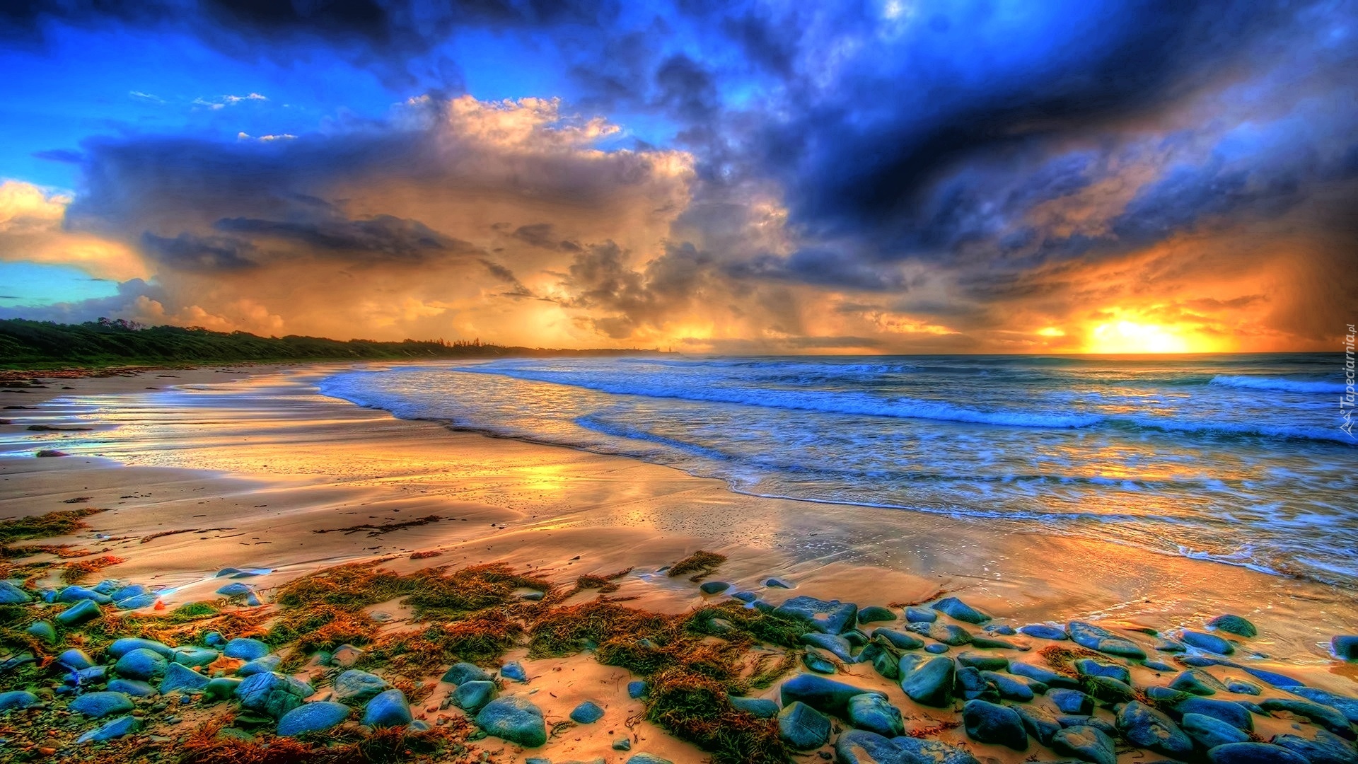 Edytor tapety: Kamienie, Plaża, Morze, Zachód, Słońca