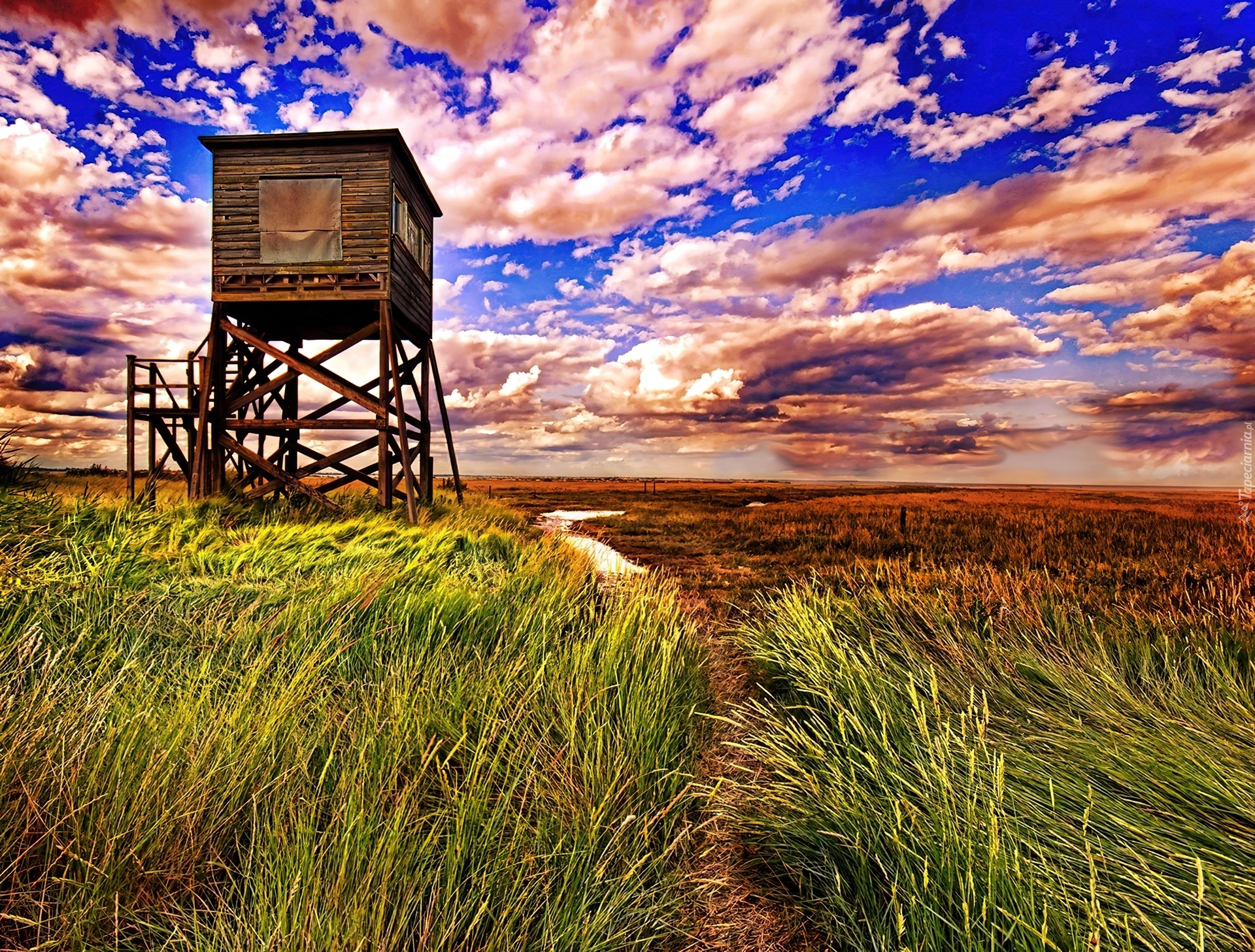 Edytor tapety: Chmury, Zachód, Słońca, Trawa, Domek