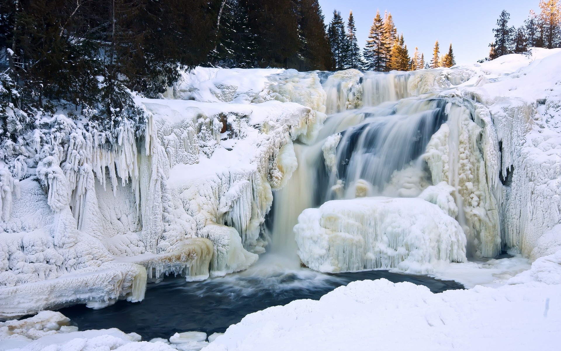 Edytor tapety: Wodospad, Śnieg, Choinki