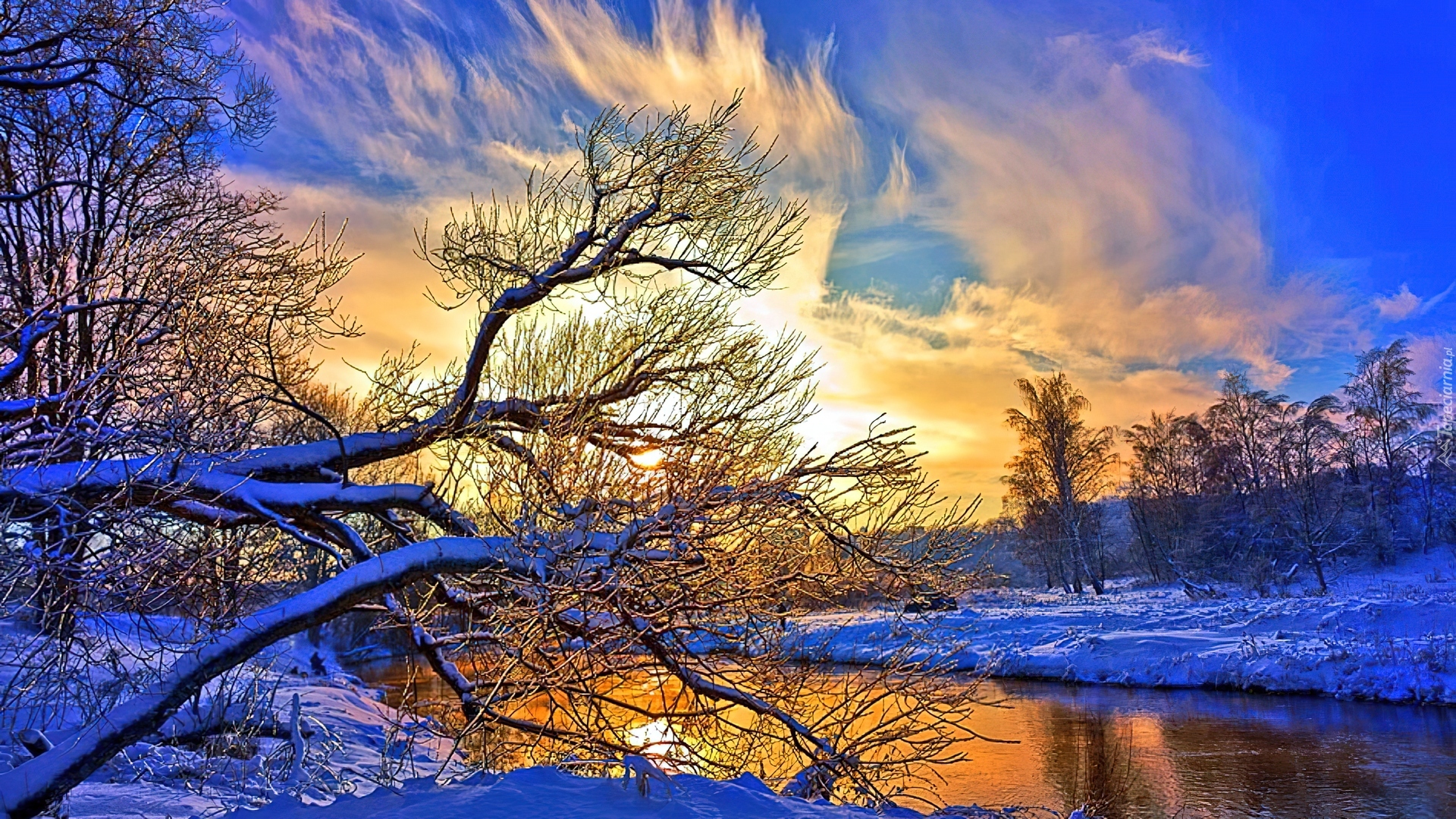 Edytor tapety: Drzewa, Zima, Rzeka, Zachód, Słońca