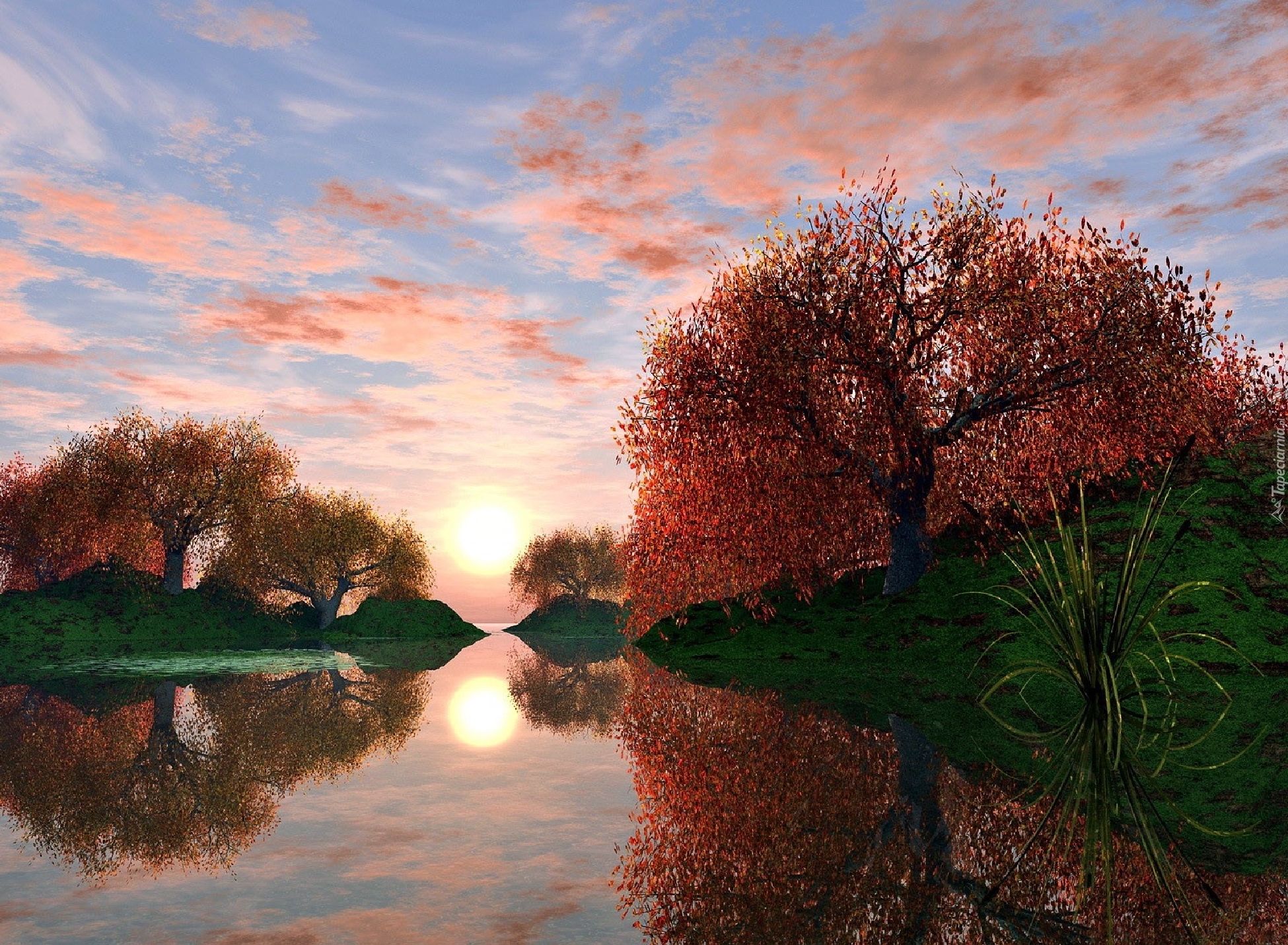 Edytor tapety: Jezioro, Zachód, Słońca, Drzewa