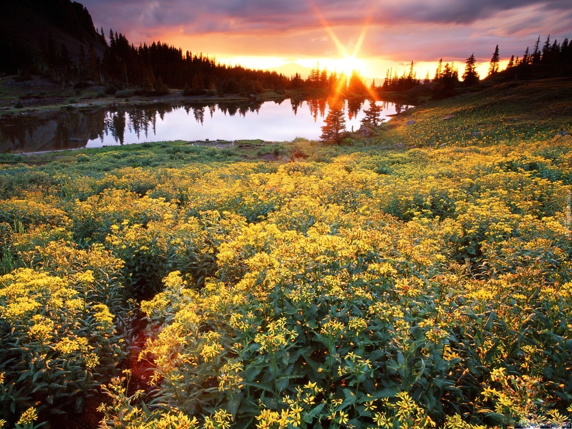 Edytor tapety: Zachód, Słońca, Jezioro, Lasy, Kwiaty