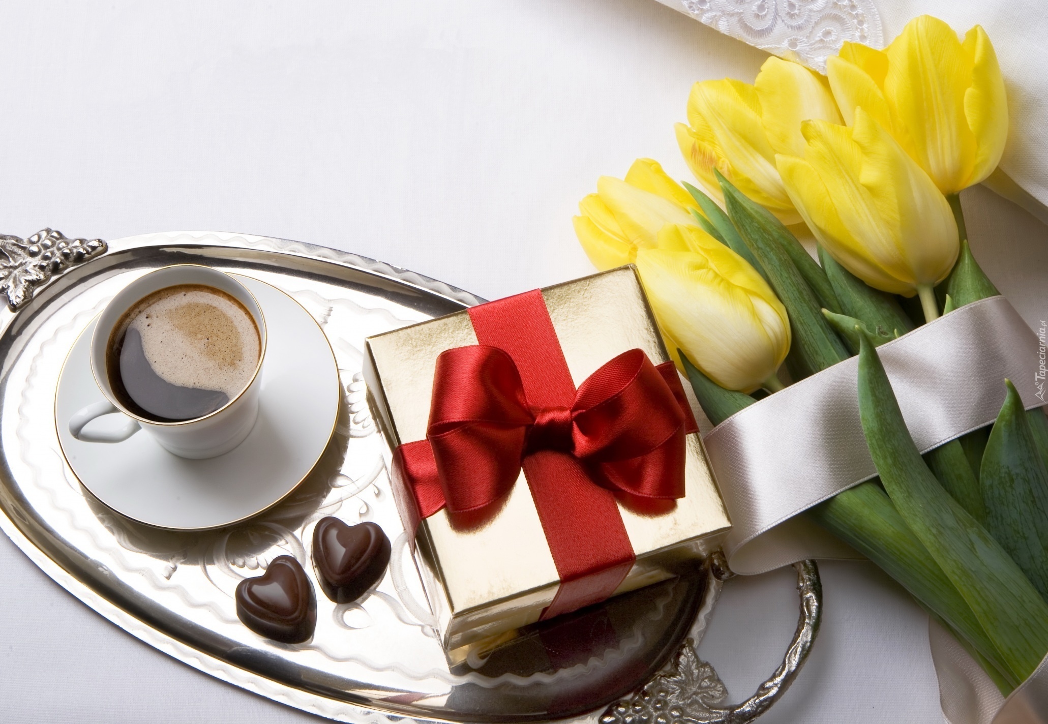 Edytor tapety: Żółte, Tulipany, Kawa, Prezencik