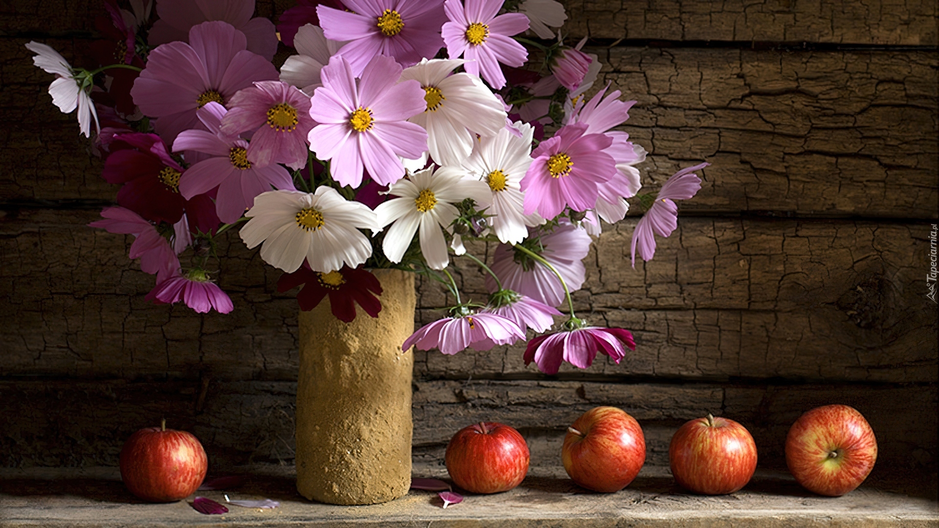 Edytor tapety: Fioletowo, Biała, Kosmea, Wazon, Jabłka