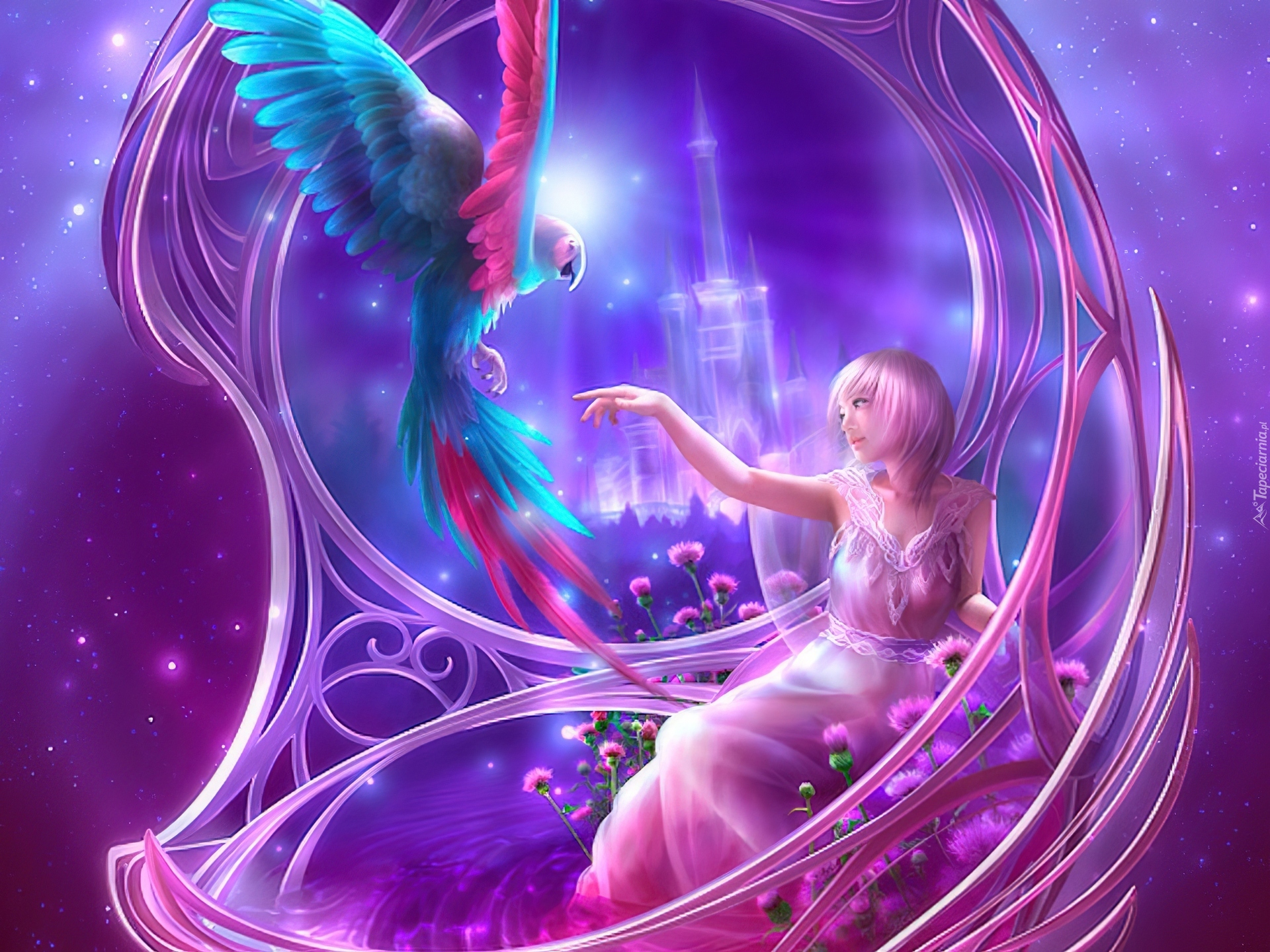 Edytor tapety: Dziewczyna, Ręka, Papuga, Kwiaty