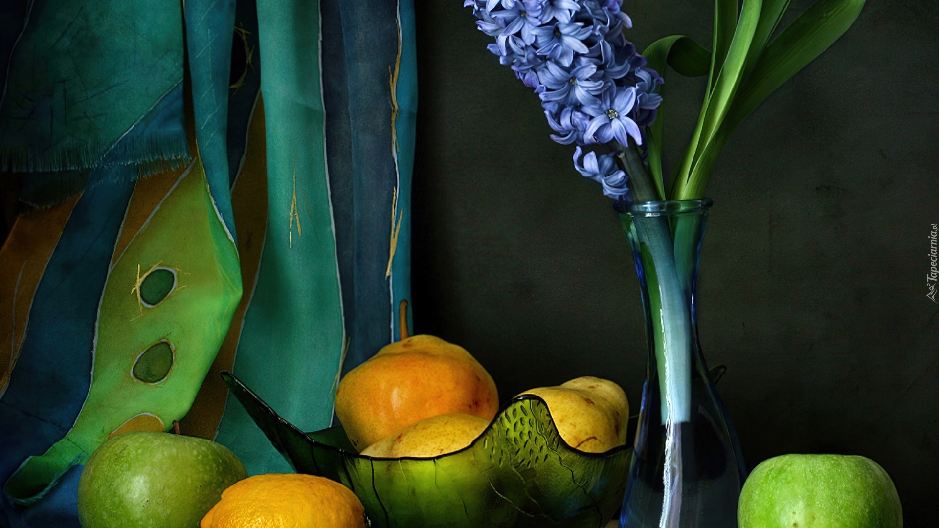 Edytor tapety: Miseczka, Owoce, Flakon, Hiacynt