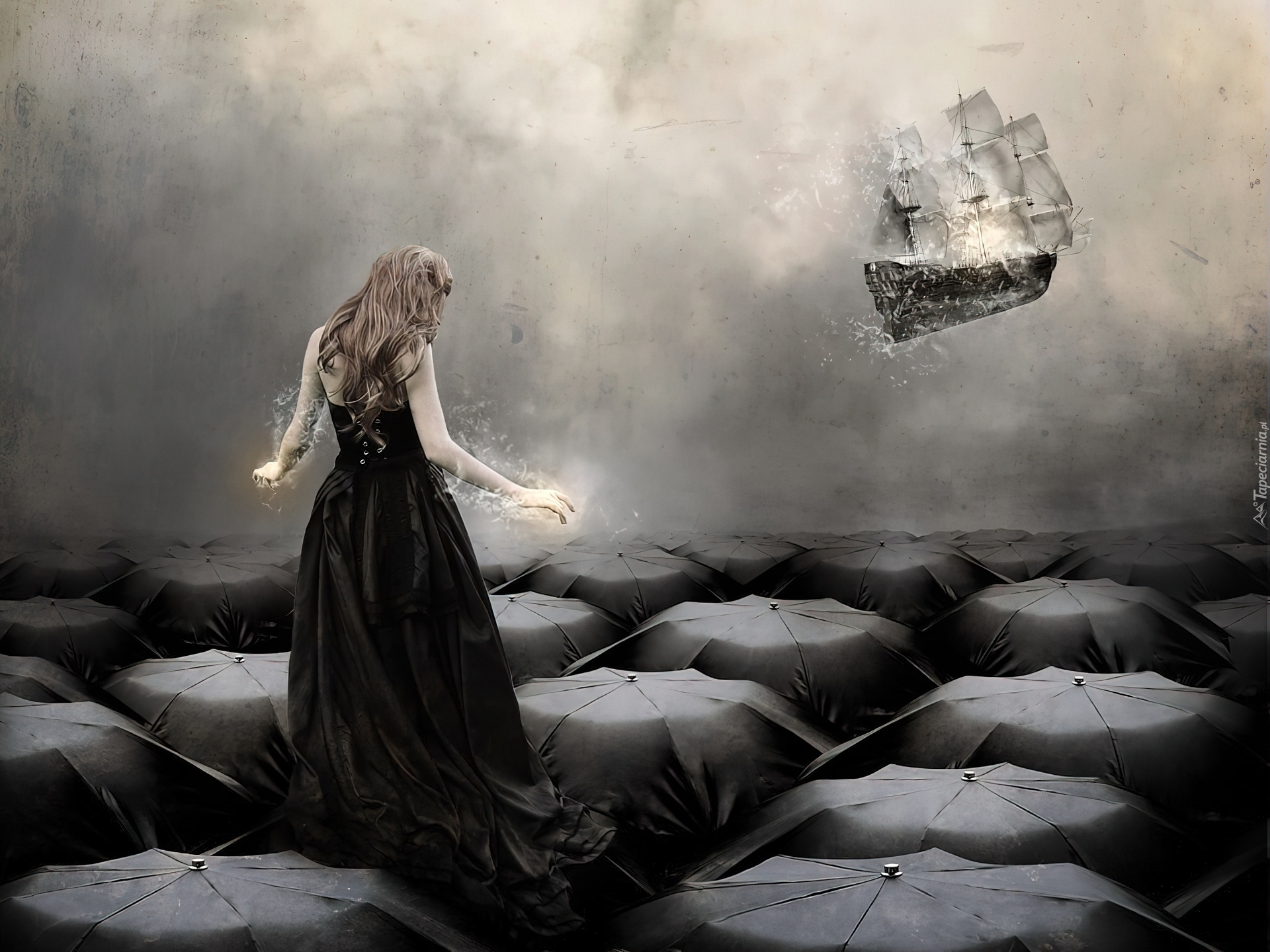 Edytor tapety: Kobieta, Fantasy, Parasole, Kobieta, Żaglowiec