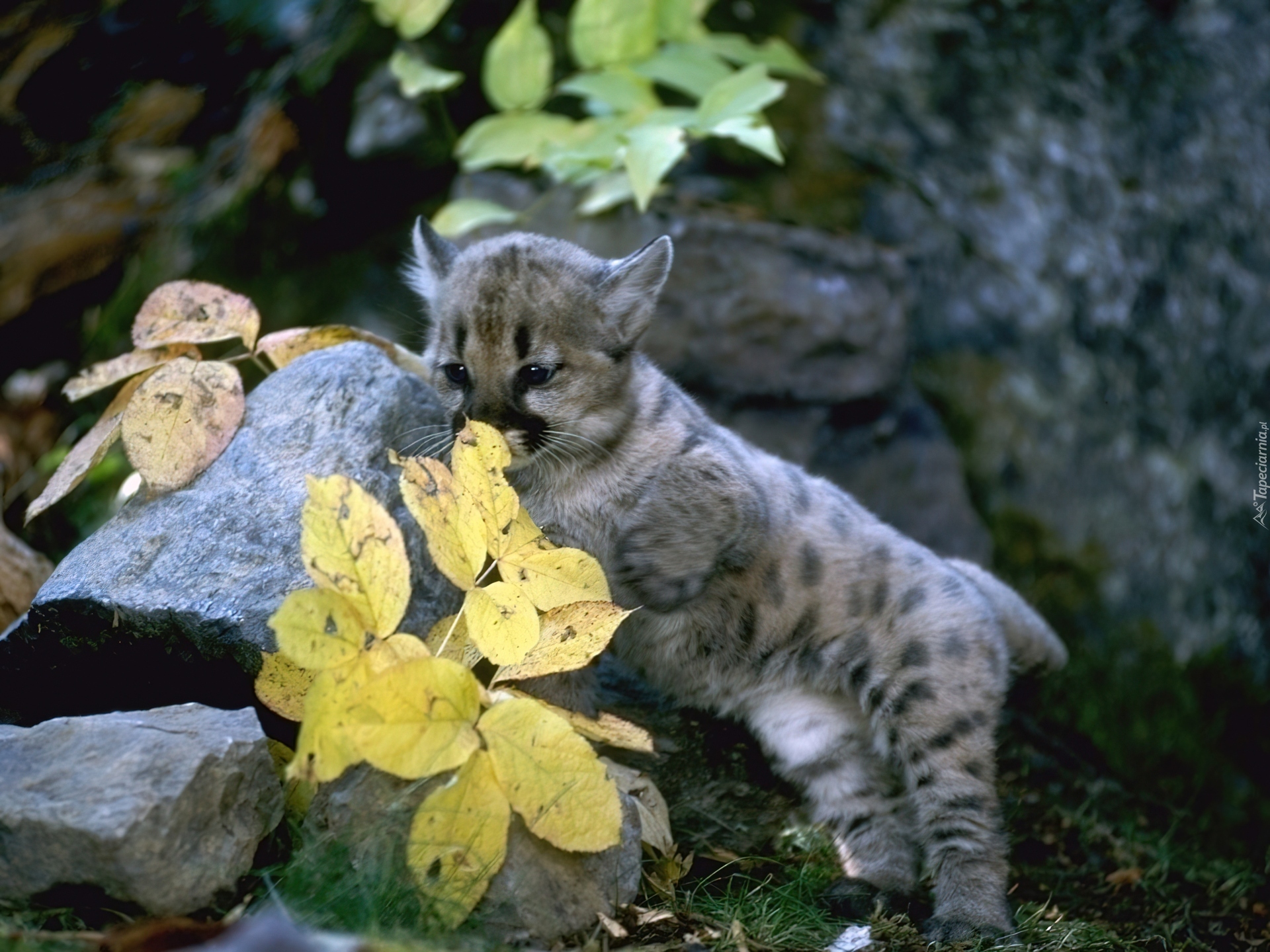Edytor tapety: Mała, Puma, Skały, Liście