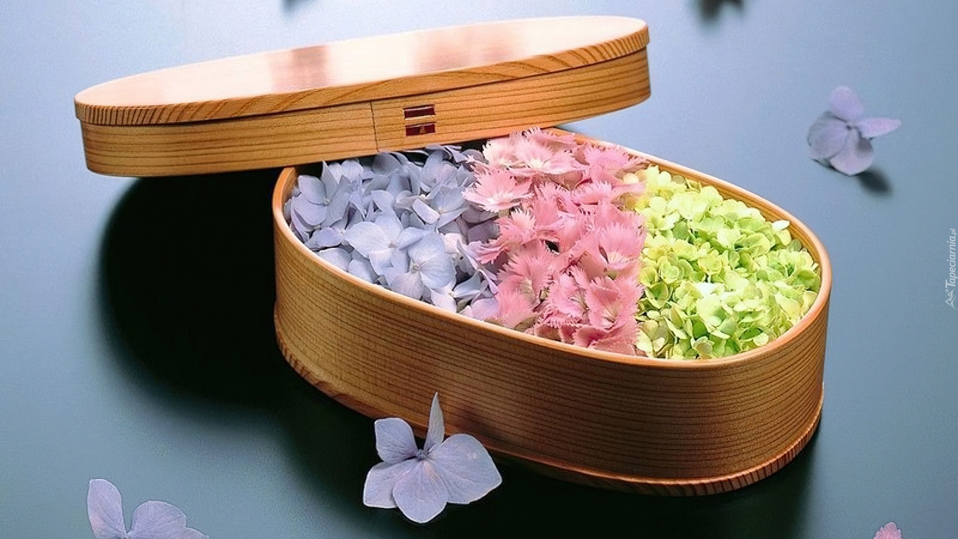 Edytor tapety: Drewniane, Pudełko, Kolorowe, Kwiatuszki
