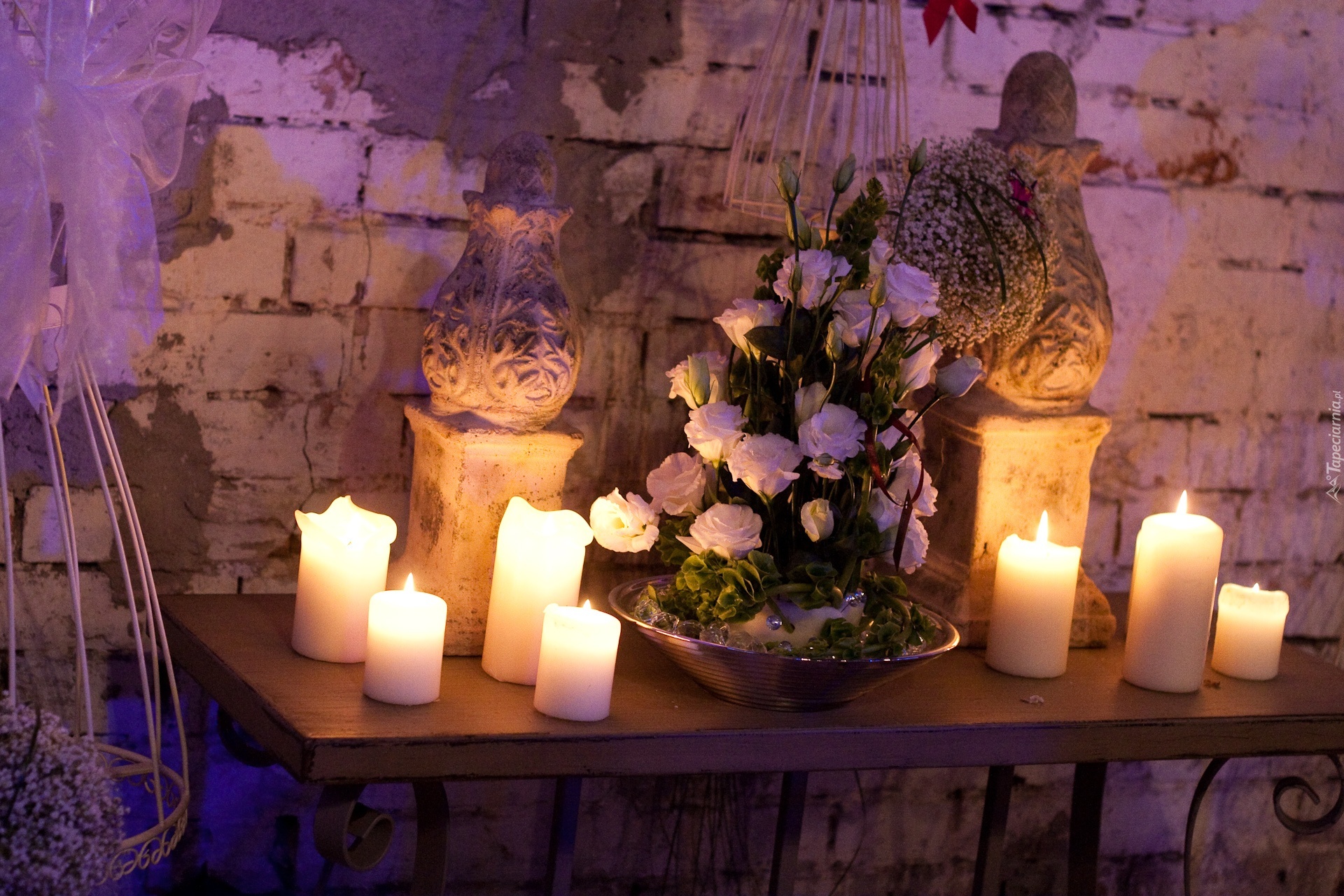 Edytor tapety: Kompozycja, Białe, Świece, Stół, Kwiaty, Eustoma
