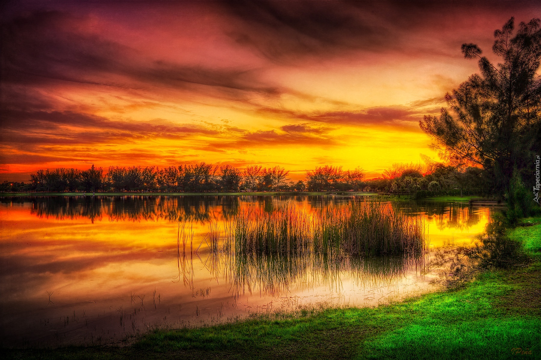 Edytor tapety: Zachód, Słonca, Jezioro, Trawa, Drzewa