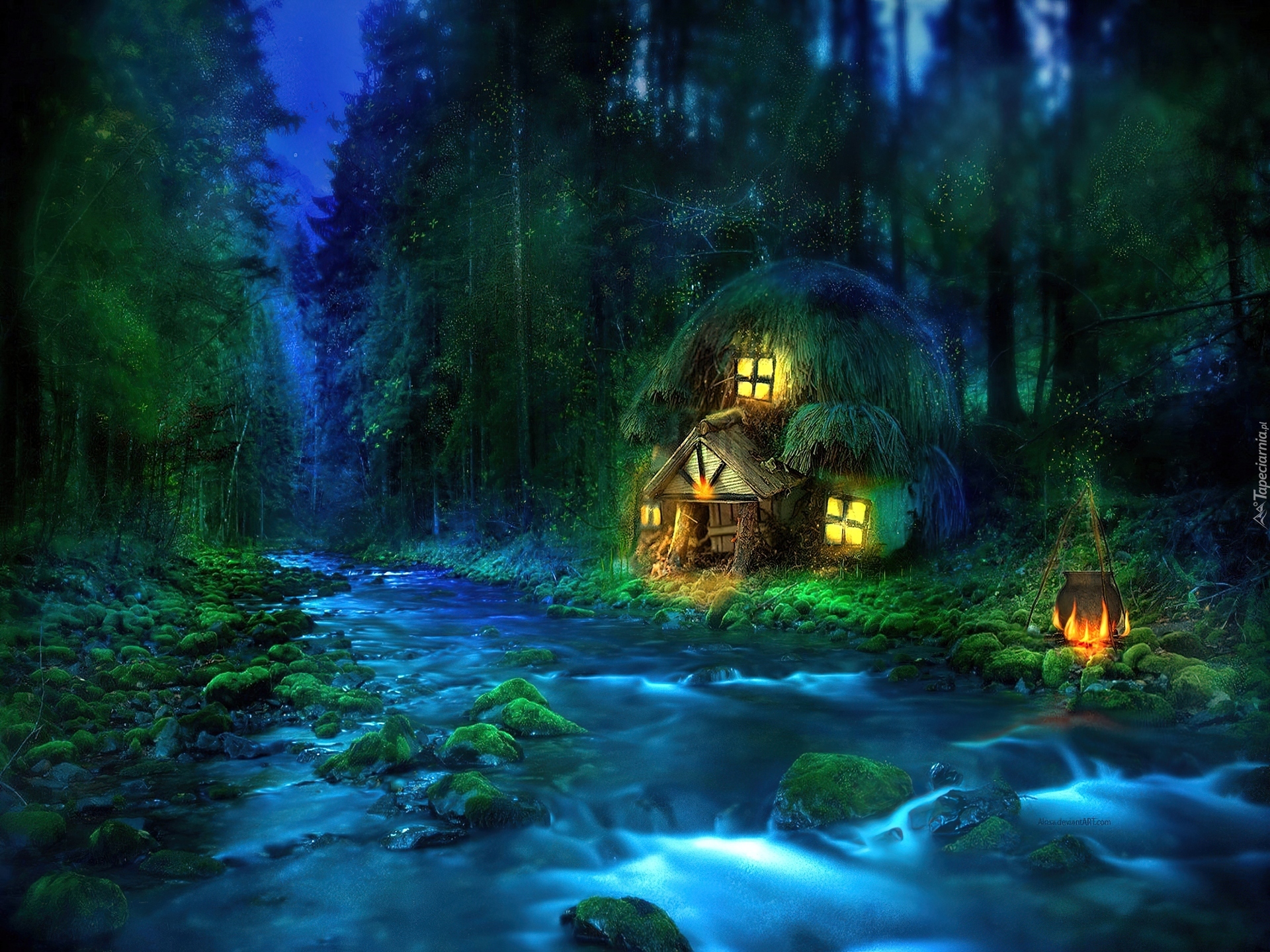 Edytor tapety: Las, Domek, Woda, Noc, Fantasy