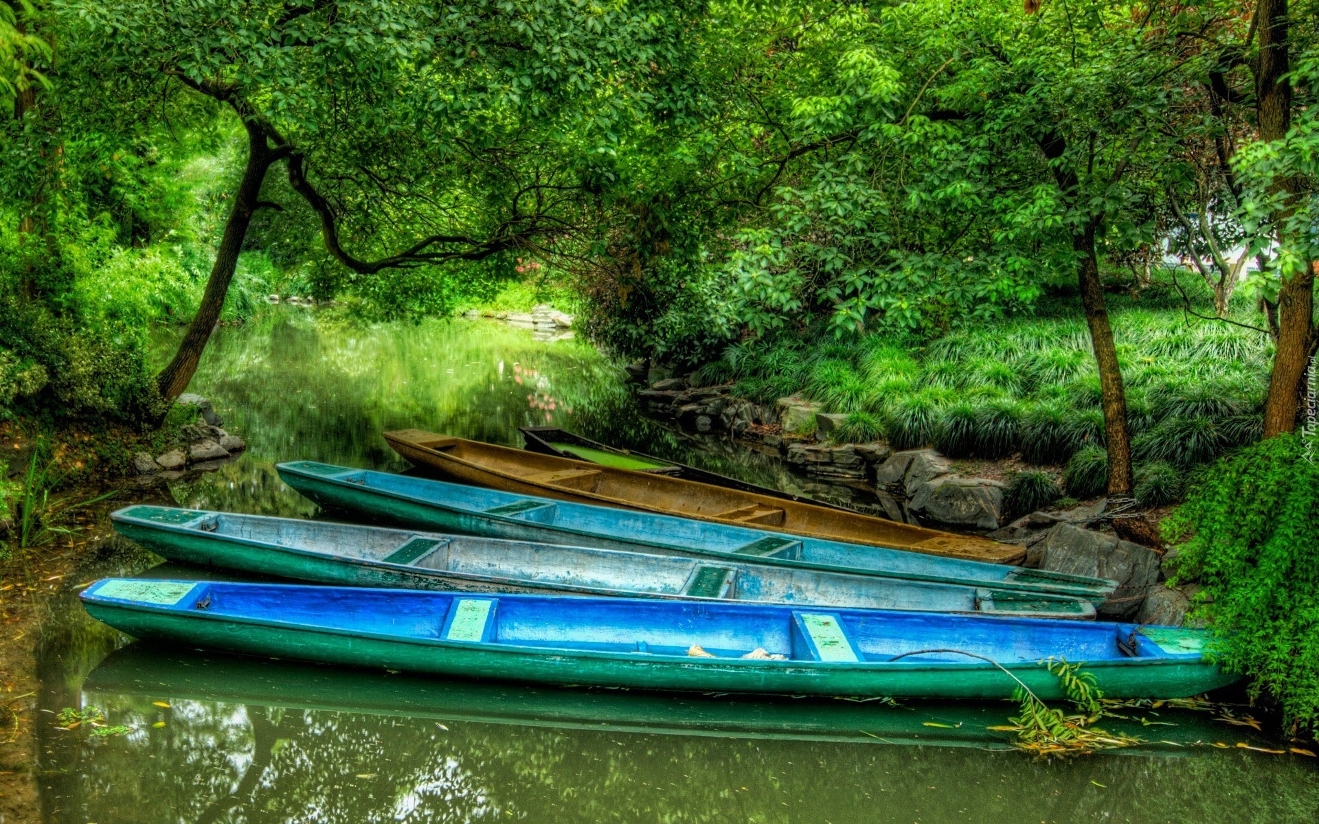 Edytor tapety: Jezioro, Drzewa, Kajaki