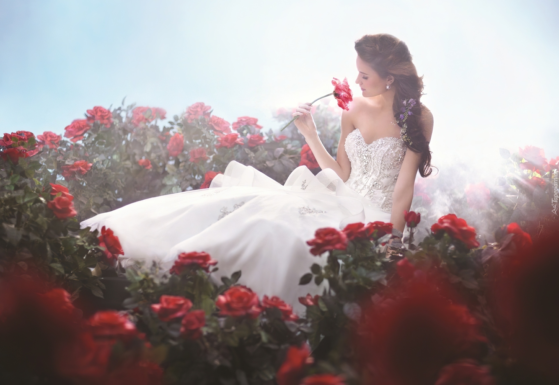 Edytor tapety: Kobieta, Biała, Suknia, Róże