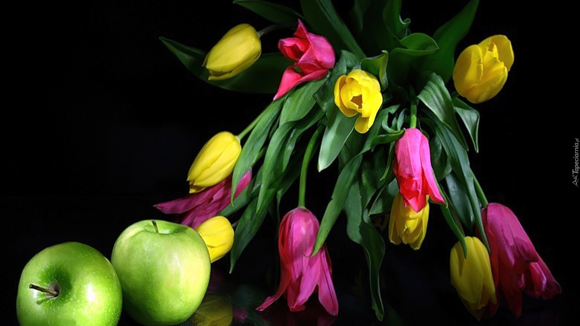 Edytor tapety: Kolorowe, Tulipany, Zielone, Jabłka